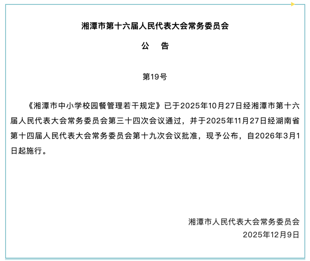 《》的出台,是湘潭市以体例保障和改善教育平易近生的具体实践,为全省甚至全国校园餐办理供给了无益的“湘潭样本”。后续,市教育局将牵头推进各项沉点使命落实落地,不竭提拔校园餐平安办理和养分保障程度,切实守护中小学生健康成长,加强群众获得感、幸福感、平安感。