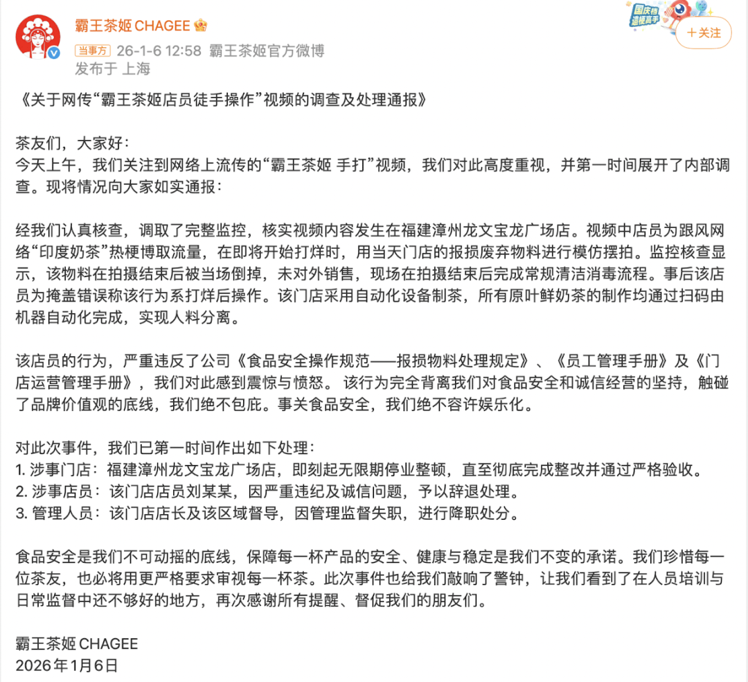 霸王茶姬暗示,对于该伙计的行为感应取,已第一时间做出处置。涉事门店福建漳州龙文宝龙广场店,即刻起破产整理,曲至完全完成整改并通过严酷验收。涉事伙计刘某某,因严沉违纪及诚信问题,予以辞退处置。涉事门店店长及该区域督导,因办理监视失职,进行降职处分。